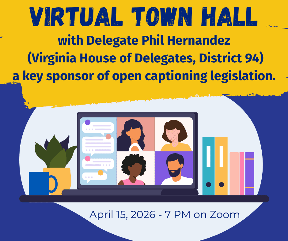 Join the Deaf and Hard of Hearing community for an important and timely virtual town hall focused on open captioning legislation and accessibility in Virginia. This event centers the lived experiences of Deaf, Hard of Hearing, Late-Deafened, and DeafBlind individuals and highlights why open captions are essential for full access in public spaces such as movie theaters, live performances, and community events.